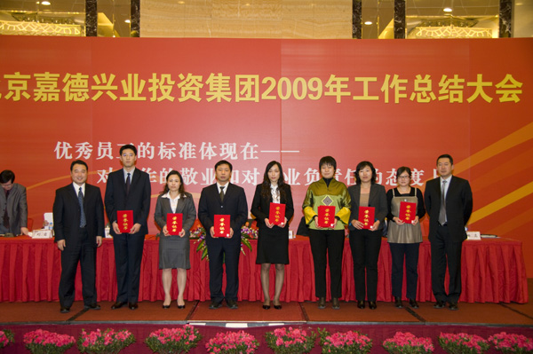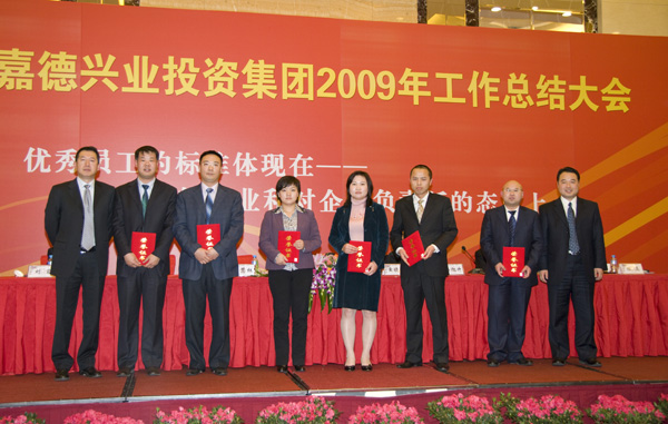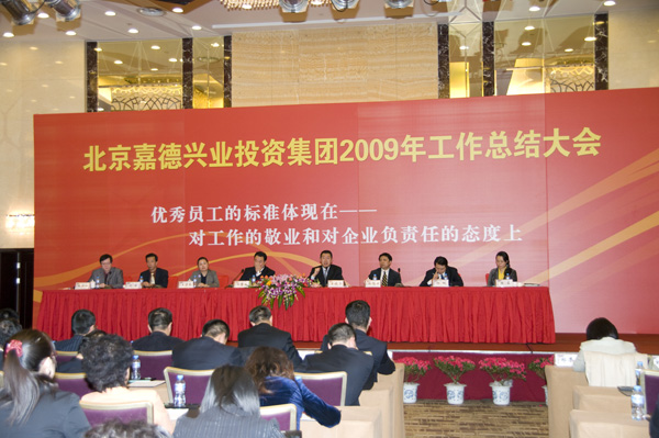 嘉德投資集團2009年度工作總結大會,2010年2月10日9:00在南宮溫泉度假酒店召開。總結大會的主題圍繞著集團在2009年取得的成績和2010年的工作方向進行深入的分析與設想。在總結大會上各項目公司老總分別發(fā)言,向集團全體員工匯報2009年的工作和2010年的發(fā)展目標。最后由集團董事長黃曉華、總裁鄭慧紅做出總結性的發(fā)言,深入的剖析了集團的現狀,并對日后的發(fā)展做出了明確的指導。