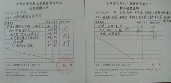 2010年7月21日下午,北京佰嘉置業有限公司將一批愛心物資及捐款送到了太陽村。