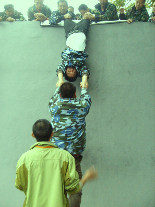 最后一個項目是“畢業墻”,當我們齊心協力采用倒掛金勾的方式把最后一個隊員拉上來畢業墻時,大家歡呼雀躍,我們完成了剛開始看似不可能完成的任務,最后大家亢奮的齊唱隊歌迎來了畢業時刻。